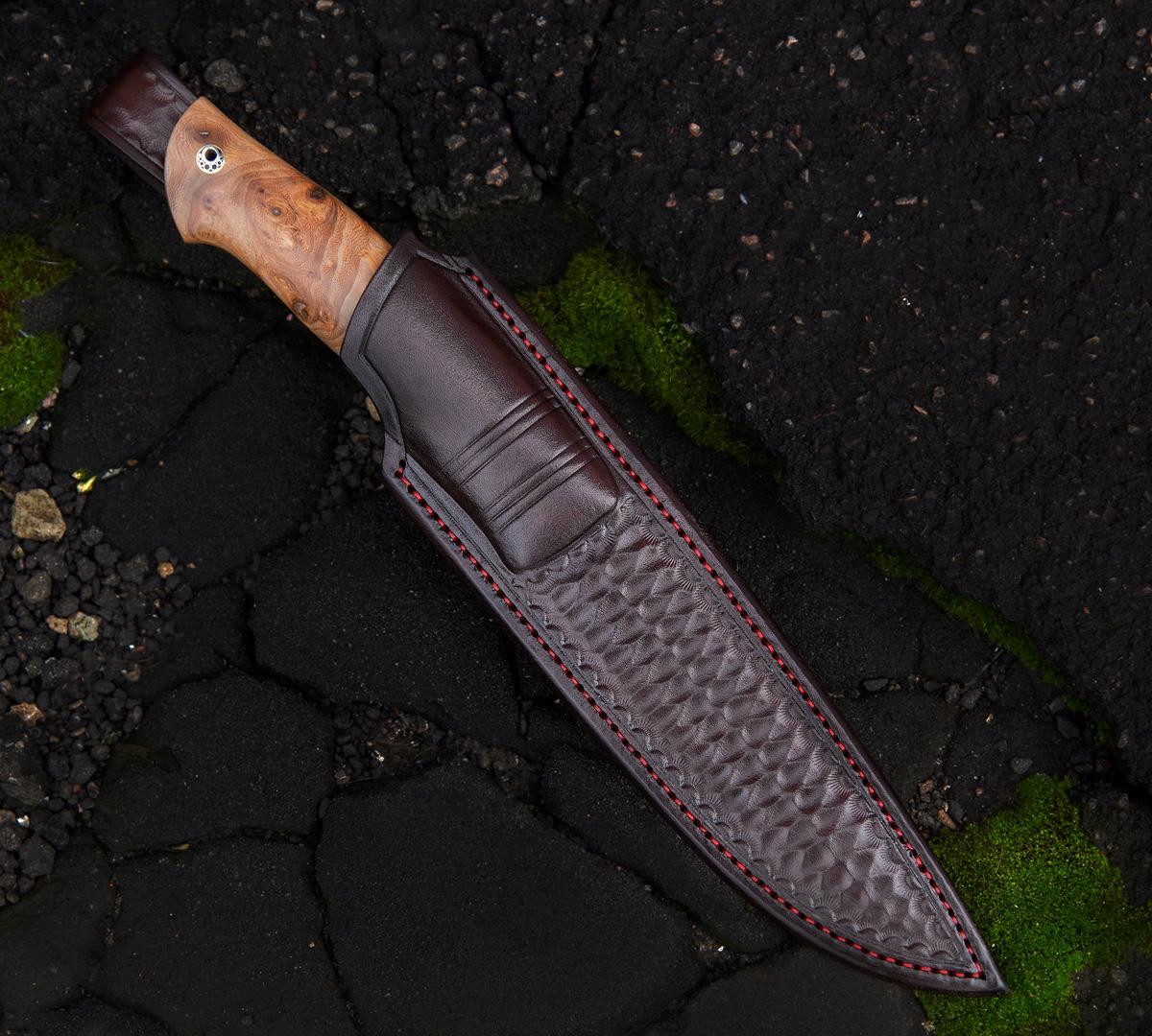 Нож Сибиряк из ламинированной стали, рукоять - стабилизированный кап клёна, вставка - позвоночник кита, формованный чехол идет в комплекте.