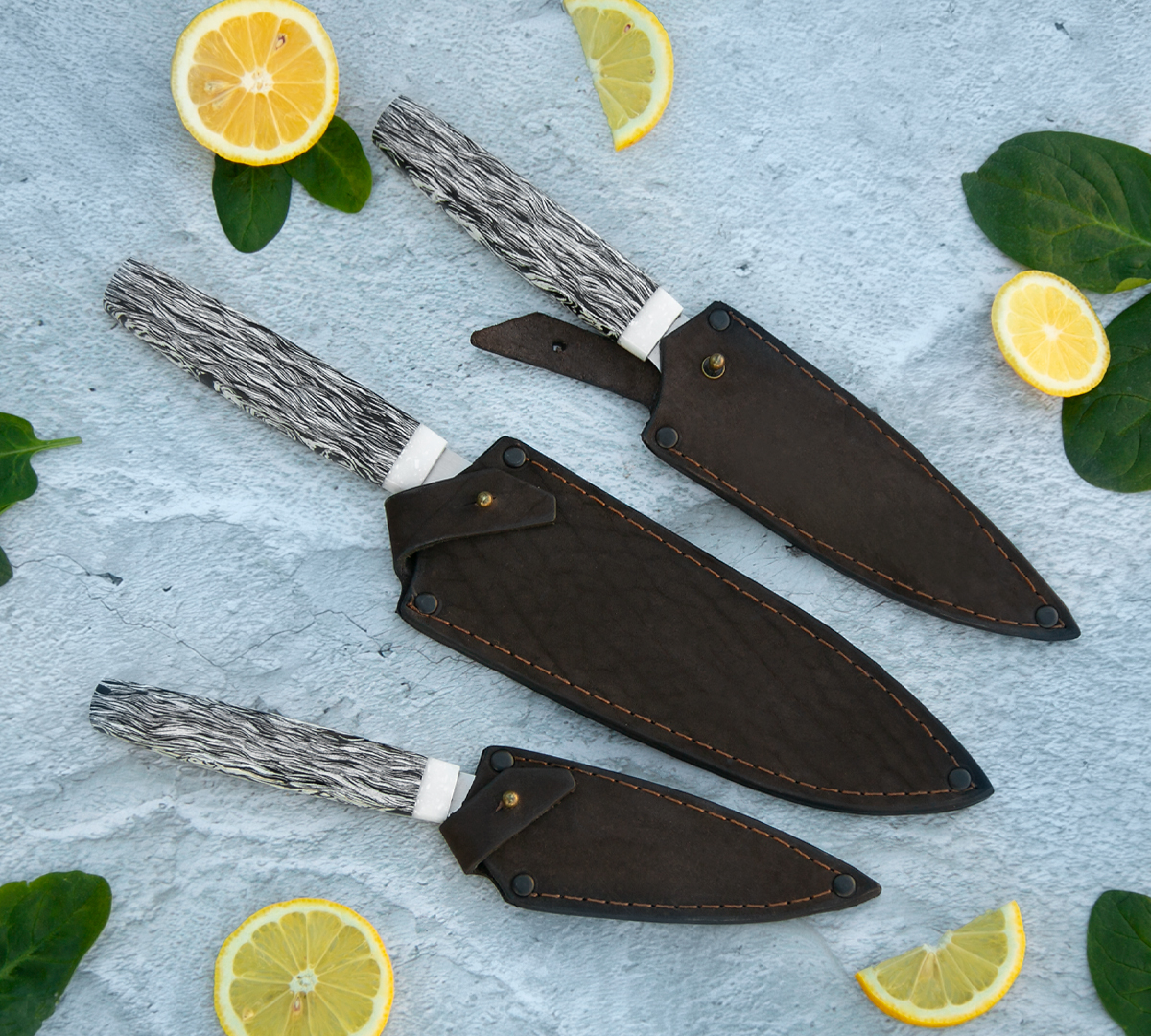 Набор Кухонных ножей из нержавеющей стали N690, рукоять - G10. Кожаные чехлы в комплекте.